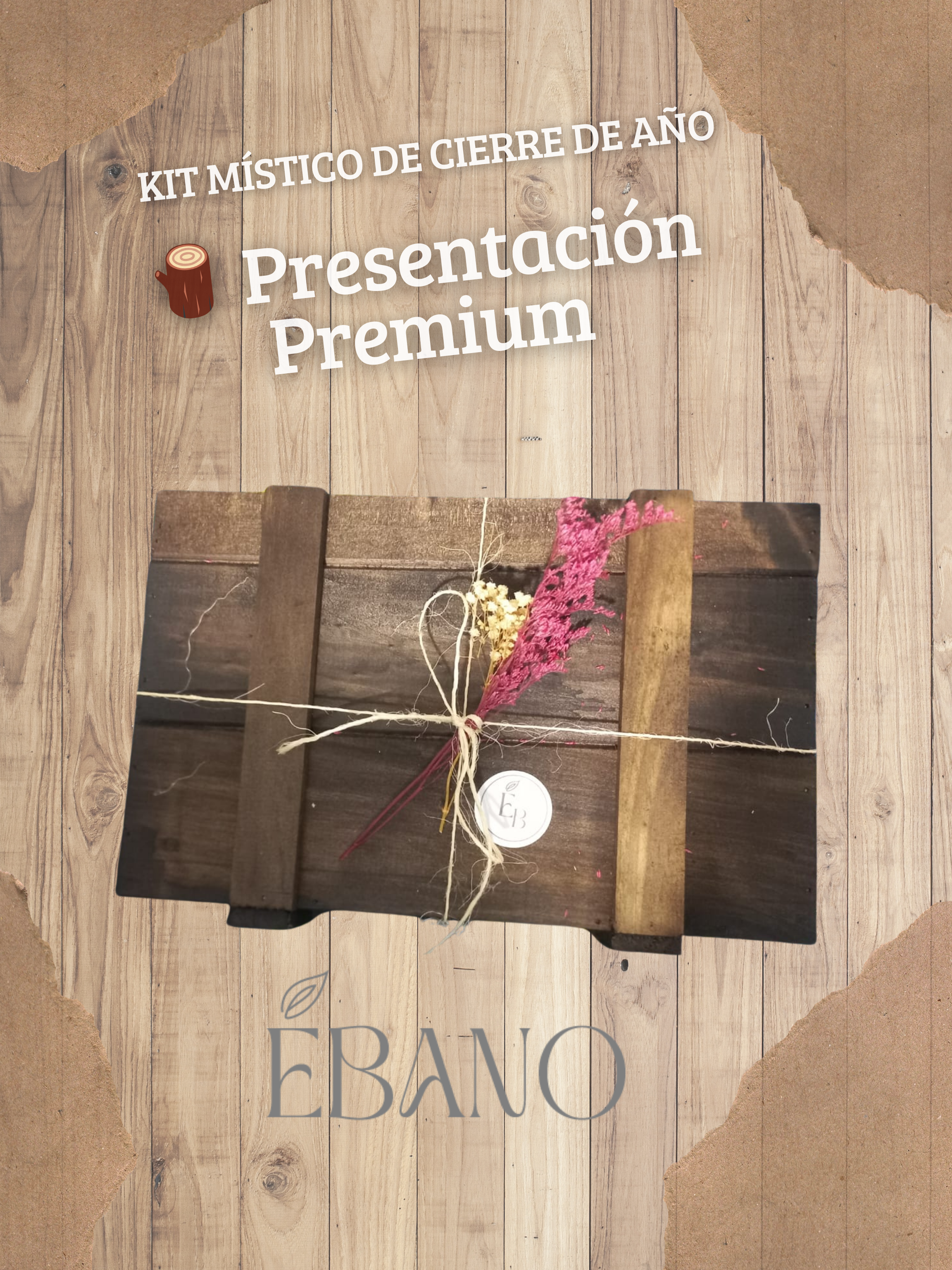 Todos los elementos vienen empacados en un elegante cofre de madera de pino rústica, elaborado artesanalmente y decorado con flores secas y sello de la marca ÉBANO.